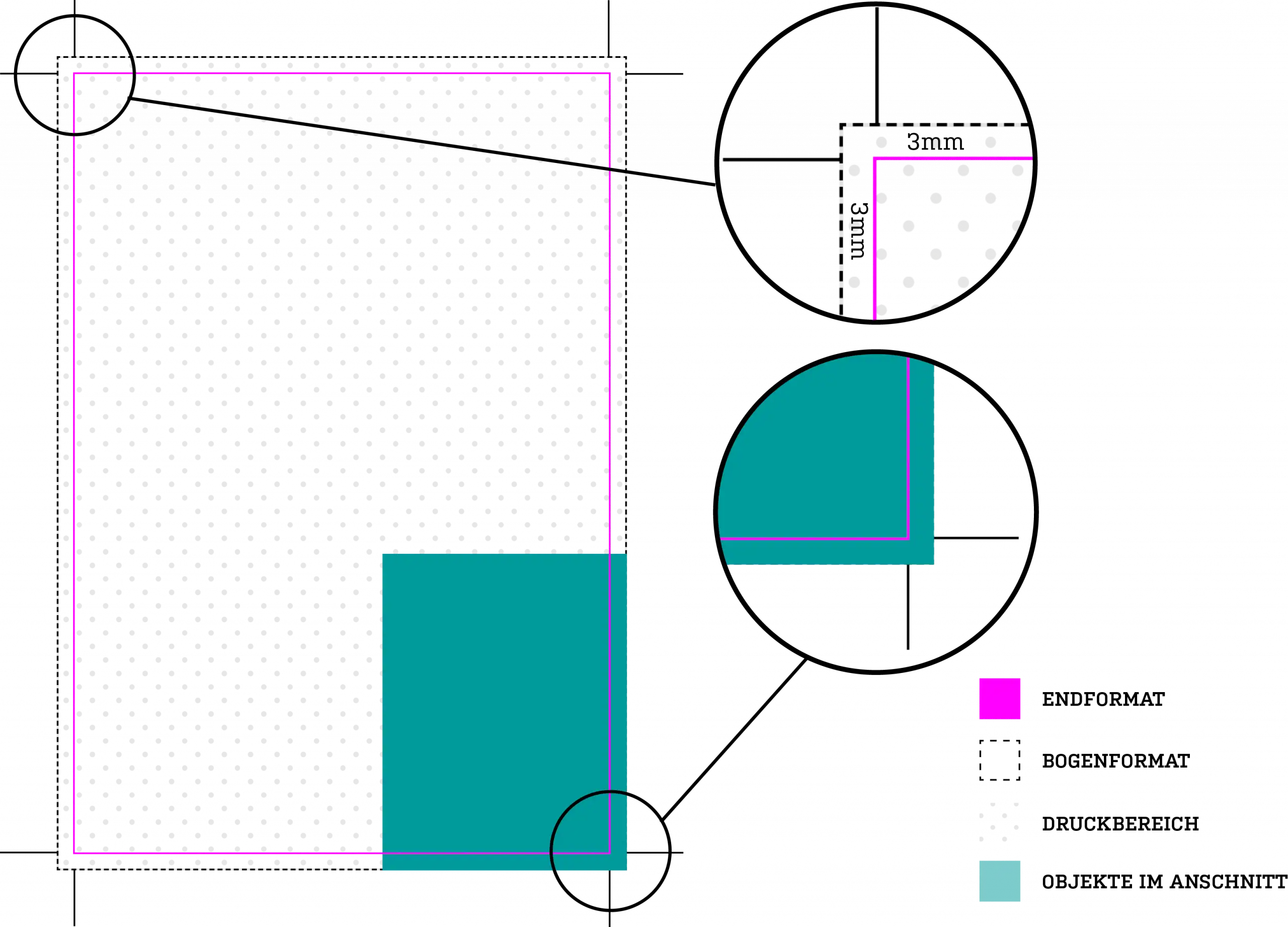 - Seitenformat & Anschnitt: Legen Sie Ihr Design im exakten Endformat an und fügen Sie einen Beschnitt von 3 mm hinzu.